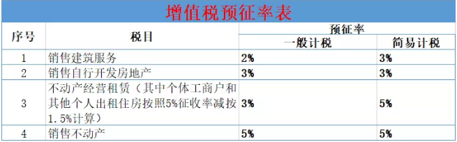 三預(yù)征率 預(yù)征率有3檔,2%,3%和5%。簡易計稅的預(yù)征率基本上與征收率一致。銷售不動產(chǎn)和銷售自行開發(fā)房地產(chǎn)的預(yù)征率簡易計稅與一般計稅相同。注意:換算成不含稅價時,分母為稅率或征收率,而不是預(yù)征率。如納稅人出租不動產(chǎn)適用一般計稅方法計稅的,應(yīng)預(yù)繳稅款=含稅銷售額÷(1+9%)×預(yù)征率3%