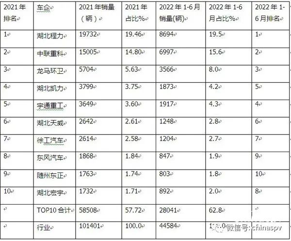 2022年上半年環(huán)衛(wèi)車市場趨勢:湖北程力、福建龍馬、中聯(lián)重科居前三,新能源專用汽車表現(xiàn)搶眼。環(huán)衛(wèi)車屬于商用車行業(yè)中專用車類的一個小眾市場,包括各類垃圾車、灑水車、洗掃車、吸污車等。近年來隨著經(jīng)濟(jì)的發(fā)展與人民生活水平的不斷提高,特別是近期受疫情的影響,人們對環(huán)境衛(wèi)生質(zhì)量的要求越來越高,同時隨著垃圾分類、城鎮(zhèn)化、農(nóng)村環(huán)境整治等利好政策得到有效落地執(zhí)行,將促進(jìn)垃圾車、清掃車等環(huán)衛(wèi)車輛需求呈穩(wěn)定上升趨勢,因此環(huán)衛(wèi)車市場已引起業(yè)內(nèi)的關(guān)注。但由于受疫情影響,今年上半年環(huán)衛(wèi)車市場也遭遇下滑。 根據(jù)終端上牌信息,2022年6月環(huán)衛(wèi)車銷量8629輛,環(huán)比(今年5月環(huán)衛(wèi)車銷量8019輛)增長7.6%,同比(去年6月銷量10385輛,見截圖1)下降16.9%,2022年1-6月環(huán)衛(wèi)車?yán)塾嬩N售44584輛,同比(2021年前6月累計銷售54801輛)下降18.6%,累計降幅比1-5月(1-5月累計同比下降19%)縮窄近0.4個百分點。 截圖1,2021年各月環(huán)衛(wèi)車銷量(數(shù)據(jù)來源:汽車智庫) 按功能用途劃分,2022年6月及前6月,環(huán)衛(wèi)車中垃圾車銷量均為最多,分別銷售3133輛和累計銷售16413輛,占據(jù)環(huán)衛(wèi)車的市場份額分別為36.3%和36.2%;其次是灑水車;再次是吸污車;第四是洗掃車; 在2022年6月及前6月環(huán)衛(wèi)車銷量最大的垃圾車市場中,車廂可卸式垃圾車占比均超半壁江山,領(lǐng)跑垃圾車各細(xì)分車型銷量; 按燃料種類劃分,今年上半年柴油類環(huán)衛(wèi)車仍占主體,但主體地位有減弱趨勢;新能源環(huán)衛(wèi)車?yán)塾嬩N售2240輛,市場占比超5%,且占比比2021年增加1.32個百分點,領(lǐng)漲環(huán)衛(wèi)車各細(xì)分市場,表現(xiàn)搶眼,其中新能源自卸式垃圾車?yán)塾嬩N售472輛,領(lǐng)領(lǐng)跑新能源環(huán)衛(wèi)車各細(xì)分車型; 從今年上半年環(huán)衛(wèi)車的區(qū)域市場流向看,湖北、山東、廣東居前三; 從今年上半年企業(yè)具體表現(xiàn)看,湖北程力、長沙中聯(lián)重科、福建龍馬環(huán)衛(wèi)車居前三。 下面對今年上半年環(huán)衛(wèi)車市場特點進(jìn)行解讀。 特點一:按功能用途劃分,各類垃圾車銷量占比超三之一,居榜首 表1,2022年6月及1-6月各類環(huán)衛(wèi)車銷量同比、占比及占比同比增減(數(shù)據(jù)來源:汽車智庫及終端上牌信息) 2022年上半年環(huán)衛(wèi)車市場趨勢:湖北程力、福建龍馬、中聯(lián)重科居前三,新能源專用汽車表現(xiàn)搶眼。 ---各類環(huán)衛(wèi)車單月和累計分別銷售3133輛和16143輛,占比分別為36.3%和36.2%,均超環(huán)衛(wèi)車整體市場的三分之一份額,均居第一,說明垃圾車是環(huán)衛(wèi)車中需求最多的細(xì)分車型; ---灑水車單月和累計分別銷售2261輛和11742輛,占比分別是26.2%和26.3%,均居第二; ---吸污車單月和累計分別銷售1950輛和10161輛,占比分別為22.6%和22.8%,居第三; ---清掃車單月和累計銷量分別為1285輛和6538輛,占比分別為14.89%和14.67%,居第四,是環(huán)衛(wèi)車中占比相對較小的細(xì)分車型。 總之,無論是今年6月還是今年上半年,垃圾車占比均超三分之一,成為環(huán)衛(wèi)車中占比最高、最受市場青睞的細(xì)分車型。 特點二:車廂可卸式垃圾車占比超半壁江山,領(lǐng)跑垃圾車市場 表2,根據(jù)終端上牌信息,2022年6月及前6月各類垃圾車銷量、占比統(tǒng)計: 上表可見,2022年6月及1-6月各類垃圾車銷量及占比呈現(xiàn)以下特點: ---車廂可自卸式垃圾車單月及累計銷量分別為1660輛和8158輛,占比分別為50.1%和50.5%,占比均超半壁江山,均居第一,領(lǐng)跑各類垃圾車市場,說明車廂可卸式垃圾車最受垃圾車市場歡迎; ---壓縮式垃圾車單月和累計銷量分別為1098輛和5688輛,占比分別為35.1%和35.2%,均居第二; ---密封式垃圾車和拉臂式垃圾車無論是單月和累計銷量占比均很小; ---其他垃圾車單月和累計銷量分別為395輛和2005輛,主要包括各種倉廚垃圾車、掛桶式垃圾車等,占比分別為12.6%和12.5%。 特點三:新能源環(huán)衛(wèi)車占比增加最多,表現(xiàn)搶眼 截圖2,2019年—2021年各類動力環(huán)衛(wèi)車銷量占比(來源:汽車智庫平臺) 表3,根據(jù)終端上牌及汽車智庫平臺數(shù)據(jù),按動力燃料種類劃分,2022年上半年各類環(huán)衛(wèi)車銷量及占比統(tǒng)計: 上圖表可見,按動力中了劃分,在今年上半年的環(huán)衛(wèi)車銷量結(jié)構(gòu)中: ---柴油類環(huán)衛(wèi)車?yán)塾嬩N售38342輛,占比86%,仍然占據(jù)絕對的霸主地位,但占比與2021年比減少1.4個百分點,與2020年、2019年比減少更多,可見近年來柴油動力環(huán)衛(wèi)車占比有逐年減少的趨勢; ---汽油動力環(huán)衛(wèi)車占比7%,居第二,且與近年比有微弱增長的跡象; ---新能源環(huán)衛(wèi)車(幾乎都是純電動類)累計銷售2240輛,占比5.02%,與2021年比占比增加1.32個百分點,是占比增加最多的細(xì)分車型,與2020年和2019年比增加更多,說明目前新能源環(huán)衛(wèi)車增長的勢頭最為強(qiáng)勁。這主要得益于國家雙碳戰(zhàn)略的持續(xù)發(fā)力。 表4,另外根據(jù)終端上牌信息,2022年上半年新能源環(huán)衛(wèi)車最暢銷的top5車型: 上表可見,在今年上半年新能源環(huán)衛(wèi)車銷量TOP