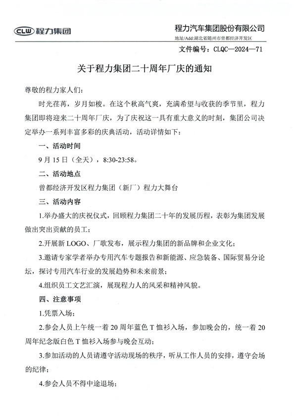 關(guān)于程力集團(tuán)二十周年廠慶的通知 尊敬的程力家人們: 時光荏苒,歲月如梭。在這個秋高氣爽,充滿希望與收獲的季節(jié)里,程力集團(tuán)即將迎來二十周年廠慶,為了慶祝這一具有重大意義的時刻,集團(tuán)公司決定舉辦一系列豐富多彩的慶典活動,活動詳情如下: 一、活動時間 9月15日(全天),8:30-23:58。 二、活動地點(diǎn) 曾都經(jīng)濟(jì)開發(fā)區(qū)程力集團(tuán)(新廠)程力大舞臺 ![]() 三、活動內(nèi)容 1.舉辦盛大的慶祝儀式,回顧程力集團(tuán)二十年的發(fā)展歷程,表彰為集團(tuán)發(fā)展做出突出貢獻(xiàn)的員工; 2.開展新LOGO、廠歌發(fā)布,展示程力集團(tuán)的新品牌和企業(yè)文化; 3.邀請專家學(xué)者舉辦專用汽車專題報告和新能源、應(yīng)急裝備、國際貿(mào)易分論壇,探討專用汽車行業(yè)的發(fā)展趨勢和未來前景; 4.組織員工文藝匯演,展現(xiàn)程力人的風(fēng)采和精神風(fēng)貌。 四、注意事項(xiàng) 1.憑票入場; 2.參會人員上午統(tǒng)一著20周年藍(lán)色T恤衫入場,參加晚會的,統(tǒng)一著20 周年紀(jì)念版白色T恤衫入場參與晚會互動; 3.參加活動的人員請遵守活動現(xiàn)場的秩序,聽從工作人員的安排,遵守會場的紀(jì)律; 4.參會人員不得中途退場; 5.請大家在活動期間注意安全,確保人身和財產(chǎn)安全; 6.請各子公司、各部門提前做好活動準(zhǔn)備工作,確保活動順利進(jìn)行; 二十年風(fēng)雨兼程,二十載春華秋實(shí),程力集團(tuán)的二十年,是拼搏奮進(jìn)的二十年,是開拓創(chuàng)新的二十年,以二十周年廠慶為新的起點(diǎn),鄭重邀請各位程力家人們出席公司“20周年慶”活動,共同分享程力集團(tuán)的美好時刻,為實(shí)現(xiàn)程力集團(tuán)愿景目標(biāo)而努力奮斗! 特此通知。 ![]() ![]() |