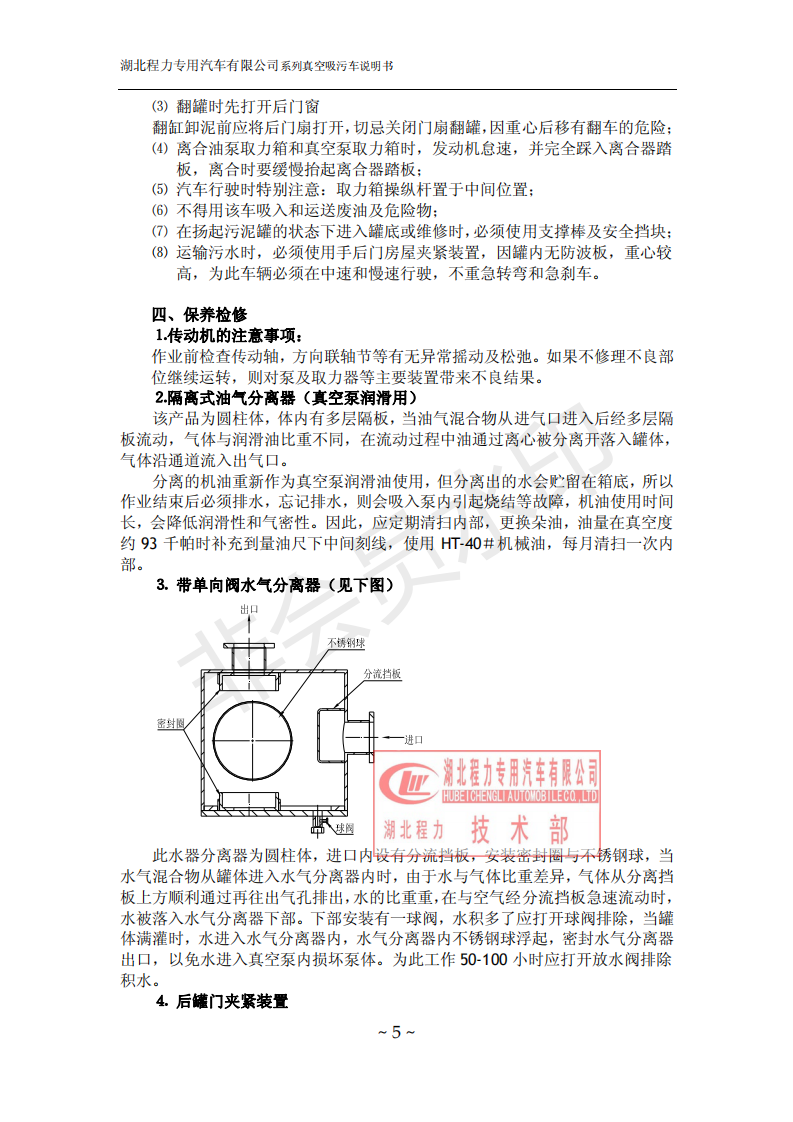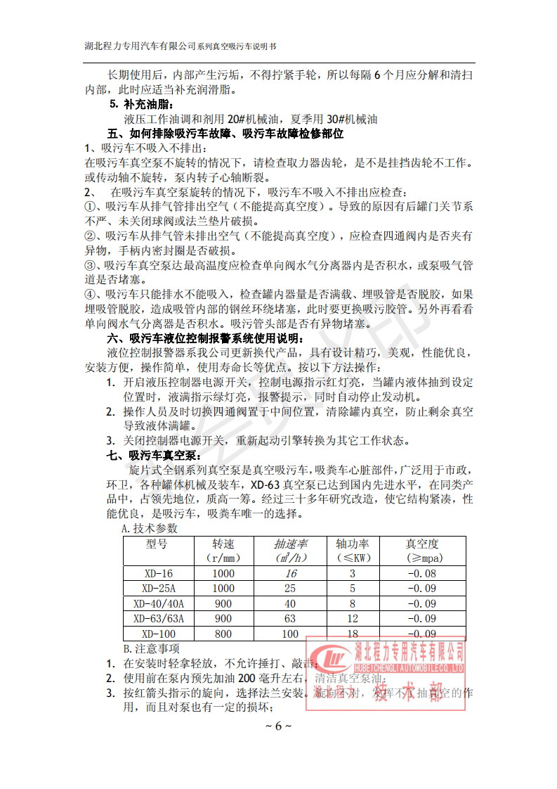 湖北程力環衛吸糞吸污車在高度真空狀態下進行吸泥、污水吸入作業,特別要注意其操作。 吸污車是由汽車底盤、取力器、傳動軸、真空吸污泵、壓力罐體、液壓部分,管網系統、真空壓力表、視糞窗、洗手裝置等組成,隨車配置大功率真空吸污泵和優質液壓系統,罐體封頭一次壓制成型、罐體可后開、雙頂自卸。具有真空度高、噸位大、效率高、用途更廣泛的特點,可廣泛適用于收集城市雨水井、檢查井及各種溝渠內的污泥、污水或石油化工污水池淤積物的抽吸、裝運和排卸。罐內污物可通過后蓋直接傾倒,應用于大、中、小城鎮環衛、市政、農業、化工、廠礦企業、物業小區等部門。 下面是吸污車如何操作和注意事項:![]() ![]() ![]() ![]() ![]() ![]() ![]() ![]() ![]() |