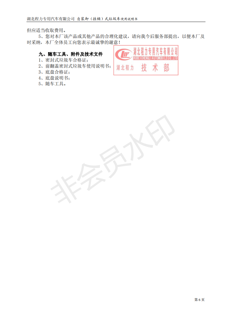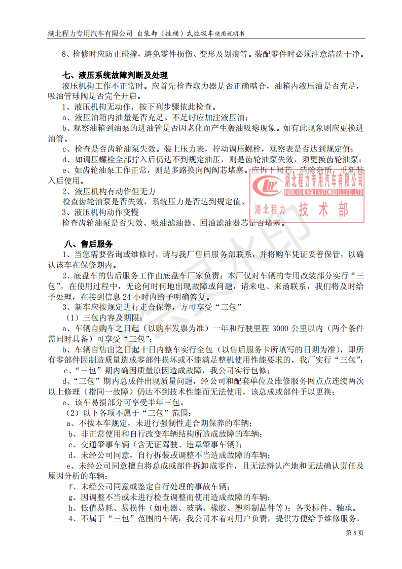 湖北程力專用汽車掛桶式垃圾車(以下簡稱掛桶式垃圾車或者勾臂式垃圾車)是用于城鎮內的垃圾收集、轉運、卸料作業的專用車輛。該車是由汽車底盤、自卸油缸、提升機總成、頂蓋(選裝)、附車架、垃圾箱體等組成。該車操作由液壓控制系統來完成,控制方式可以為手動或電氣控。該車主要用于城鎮垃圾的垃圾收集、轉運和卸料。操作開提升控制閥將垃圾桶隨提升機向上升起并翻轉傾斜,桶內垃圾被倒入車廂內完成垃圾單次裝載,反向操作提升控制閥,垃圾桶隨提升機而放下;完成垃圾裝載后再進行傾卸時,操作自卸控制閥,垃圾箱繞后翻轉軸傾斜體舉,箱體后門打開,垃圾傾卸出箱體;起該車由液壓控制系統來完成該車的提升機的上升和下降及垃圾的自卸功能,降低了工人的勞動強度和改善了工作環境。該垃圾車的收運方式是目前國內泛采用的垃圾收集轉運方式,其專用裝置的功能均以汽車發動機為動力,通過液壓機構手動或電控、氣控來實現。車輛的箱體采用優質炭鋼板全密封焊接結構,具有強度高、重量輕,防塵、防溢不產生二次污染等優點。垃圾車整車基本性能與原底盤車相同,用戶請參閱原底盤車使用手冊。本用說明書僅介紹專用改裝部分的有關操作、檢查和維修保養。在使用車輛前,我們強烈要求您能夠通讀本說明書,并對其中的操作程序做到得心應手。我廠對產品將會進一步改進。產品的改進、性能的提高、結構的不斷完善恕不另行通知,從而有某些說明不適用于您的特定車輛,敬請諒解。下面是湖北程力自裝卸式垃圾車(掛桶式垃圾車)使用說明書:![]() ![]() ![]() ![]() ![]() ![]() |