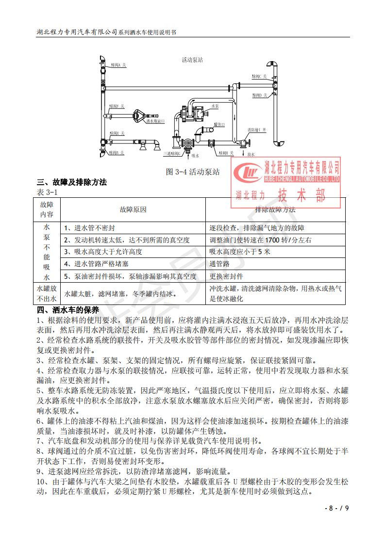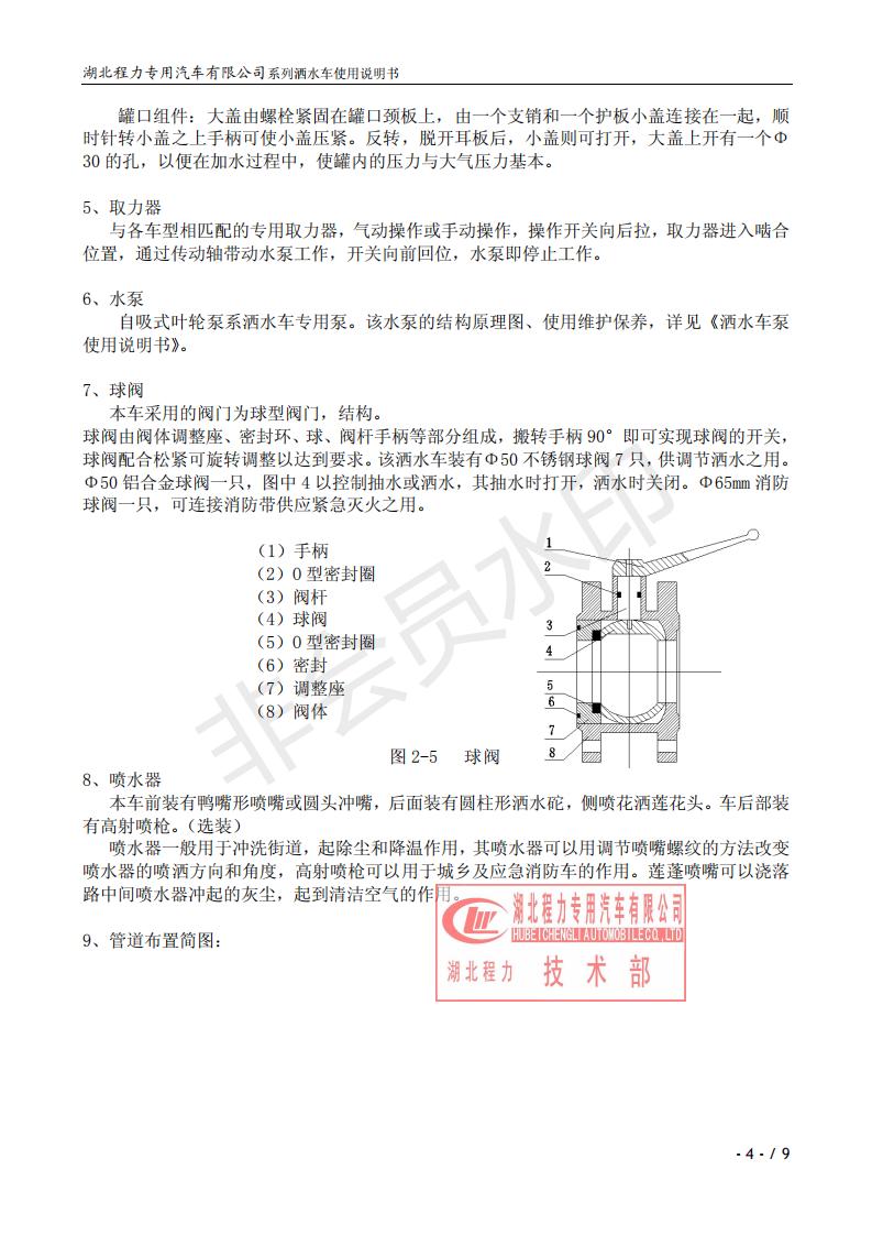 湖北程力專(zhuān)業(yè)生產(chǎn)東風(fēng)小霸王灑水車(chē)、東風(fēng)多利卡灑水車(chē)、東風(fēng)灑水車(chē)、東風(fēng)大金剛灑水車(chē)、東風(fēng)140灑水車(chē)、東風(fēng)140/47灑水車(chē)、東風(fēng)145灑水車(chē)、東風(fēng)153灑水車(chē)、東風(fēng)1254灑水車(chē)、東風(fēng)前四后八灑水車(chē)、東風(fēng)天龍灑水車(chē)、半掛灑水車(chē)、解放系列灑水車(chē)、汽油灑水車(chē)等各類(lèi)灑水車(chē)。用戶可自帶底盤(pán)我廠提供上裝部件的生產(chǎn)改裝。 灑水車(chē)前沖(噴)后灑,帶側(cè)噴,罐體后帶工作平臺(tái),平臺(tái)上安裝綠化灑水炮,灑水炮可全方位旋轉(zhuǎn),可連續(xù)調(diào)成直沖狀、大雨、小雨、毛毛雨,帶安全護(hù)欄,配備全國(guó)質(zhì)量評(píng)比第一名的杭州威龍大功率專(zhuān)用灑水泵,泵可自吸自排,安裝過(guò)濾網(wǎng),帶消防接口,可通過(guò)消防栓進(jìn)水,帶自流閥,隨車(chē)選裝20米綠化卷盤(pán),可噴灑農(nóng)藥,罐體金屬漆。 灑水泵情況說(shuō)明:大功率專(zhuān)用灑水泵,采用國(guó)際領(lǐng)先意大利技術(shù),在國(guó)內(nèi)生產(chǎn)各系列專(zhuān)用泵已有50年歷史,產(chǎn)品質(zhì)量成熟可靠,設(shè)計(jì)先進(jìn)合理,使用方便快捷,比同類(lèi)灑水泵壓力大、吸程遠(yuǎn)、使用壽命長(zhǎng),克服其它灑水泵易被雜物纏住、壓力小、吸水慢的缺點(diǎn),引領(lǐng)國(guó)內(nèi)外灑水泵行業(yè)標(biāo)準(zhǔn),市場(chǎng)占有率93%。關(guān)于湖北程力灑水車(chē)使用說(shuō)明書(shū)介紹如下,用戶不清楚可以直接打印出來(lái)。 ![]() ![]() ![]() ![]() ![]() ![]() ![]() ![]() ![]() |