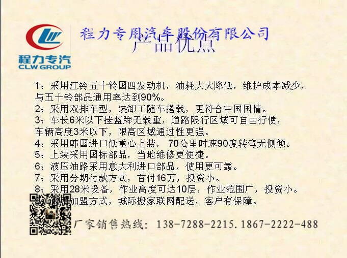 湖北程力公司生產(chǎn)的云梯搬家車的梯臂采用韓國整裝進(jìn)口,因?yàn)轫n國的搬家服務(wù)發(fā)展比較早,已經(jīng)有了非常優(yōu)質(zhì)的服務(wù)和成熟的云梯技術(shù)。進(jìn)口品牌的最大的優(yōu)點(diǎn)在于質(zhì)量穩(wěn)定、經(jīng)驗(yàn)豐富、技術(shù)過關(guān)。再結(jié)合國內(nèi)使用情況,進(jìn)行了適當(dāng)?shù)恼{(diào)整和優(yōu)化,使之更適用于中國國情。云梯搬家車的云梯單次載重400公斤,作業(yè)高度28米,可以用于工程租賃,幕墻施工、樓頂太陽能、樓頂防水作業(yè),廣告高炮,電力維修,空調(diào)室外機(jī)安裝,船舶維護(hù),搬家公司,水泥沙子搬運(yùn),路橋修護(hù)等多種功能。藍(lán)色牌照,C證駕駛,無需特種操作證。 (1)云梯采用韓國進(jìn)口技術(shù),部分部件采用韓國原廠整裝進(jìn)口!另外,我公司通過引進(jìn)、消化、改進(jìn),不斷完善云梯車的性能,也可根據(jù)客戶需求進(jìn)行加裝,改進(jìn)各項(xiàng)技術(shù)。 (2)公司在現(xiàn)有云梯基礎(chǔ)上研發(fā)出可以運(yùn)送沙子的自卸貨斗。沙子運(yùn)送到樓上以后貨斗自動(dòng)傾斜將貨斗內(nèi)的沙子卸下,這樣降低了我們的勞動(dòng)成本,同時(shí)也節(jié)省了勞動(dòng)時(shí)間。讓我們可以有更多的時(shí)間賺取更多的利潤。另外也有普通運(yùn)貨貨斗可供選擇。 (3)配備80米無線遙控系統(tǒng)。夏天可以躲在陰涼處坐著板凳操作,運(yùn)送水泥等粉塵多的作業(yè)時(shí),也能遠(yuǎn)離粉塵的吸入,工作視線一目了然。如果包天干活,沒有遙控操作系統(tǒng),操作人員要站著一天,仰視著貨斗確實(shí)太辛苦。80米無線遙控包括整車啟動(dòng),貨斗升降,到達(dá)指定位置自動(dòng)停止和液壓預(yù)熱器開關(guān)等。 (4)升降貨斗可以直達(dá)地面。大大的節(jié)省了人力,使作業(yè)更高效。另外貨斗展開后長寬為2m*2.4m。可以放較大體積的貨物。 相信品牌,相信 程力。我公司生產(chǎn)的云梯搬家車故障率低,操作更簡潔。快捷搬運(yùn)搬家選云梯搬家車,讓您賺錢更好,更快!