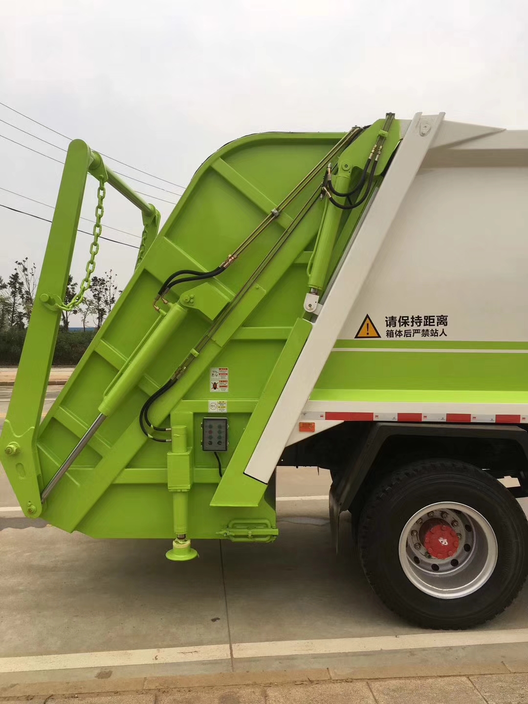 新款壓縮垃圾車,采用高強度錳鋼制成箱體,箱體邊框采用弧形制作工藝,大大加強了箱體結構的強度和使用壽命。